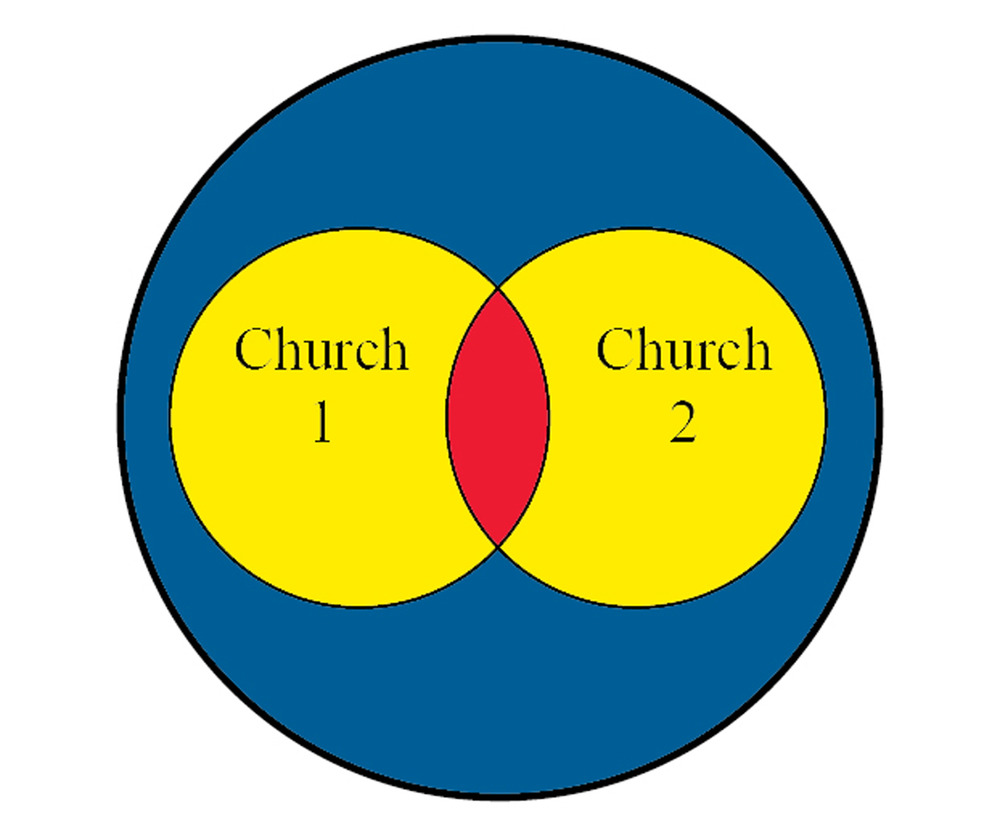 Envisioned in this way, I would suggest that CHURCH 1 is made up of those who would call themselves “religious” and CHURCH 2 is made up of those who would call themselves “spiritual.” Those in the red region might call themselves both spiritual and religious. Those in the blue might call themselves neither spiritual nor religious. You get the picture.